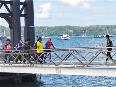 7月6日,泰国普吉岛查龙码头,打捞船换成军舰,船只无法靠岸更换码头,警察撤离该码头。 通讯员 卜志辉 摄