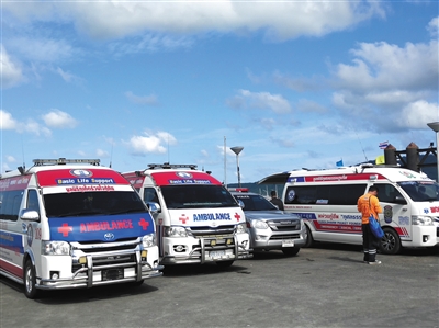 7月6日,泰国普吉岛查龙码头,救援车辆停靠在码头等待。 通讯员 卜志辉 摄