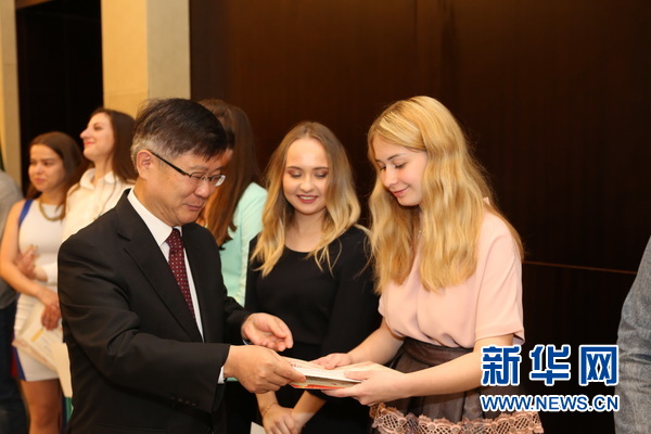 中国驻白俄罗斯大使崔启明向白俄罗斯学生颁发奖学金。新华网记者 魏忠杰摄