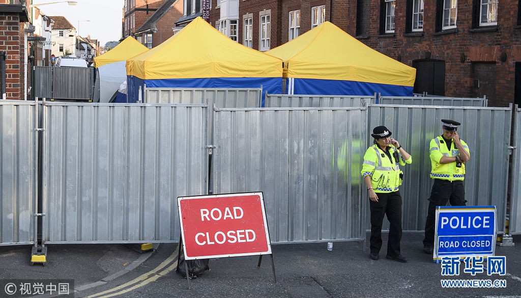 当地时间7月5日,英国埃姆斯伯里,针对一对中年夫妇中毒案件的调查仍在持续。日前,一对中年夫妇在英国埃姆斯伯里晕倒,情况危急,4日,英国警方经过调查认定,导致这对夫妇中毒的是神经毒剂“诺维乔克”,与俄前“双面间谍”斯克里帕尔及其女儿所接触到的中毒物质相同。 (图片来源:视觉中国)