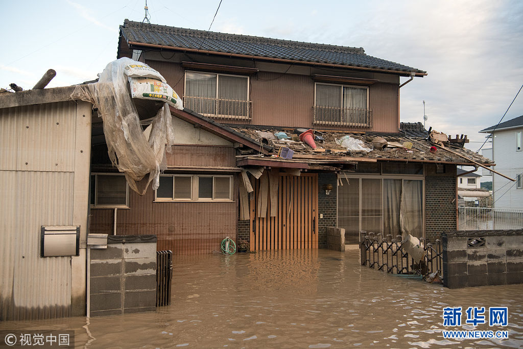 当地时间2018年7月8日,日本仓敷,暴雨几乎肆虐日本全国,河水暴涨洪水泛滥。日本连日来的暴雨灾情,已经造成85人死亡。(图片来源:视觉中国)