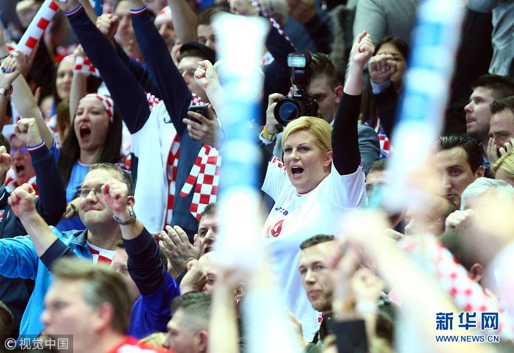 当地时间2018年1月12日,克罗地亚萨格勒布,男子手球欧洲锦标赛小组赛:克罗地亚对战塞尔维亚,克罗地亚女总统科琳达·格拉巴尔-基塔罗维奇观战。 (图片来源:视觉中国)