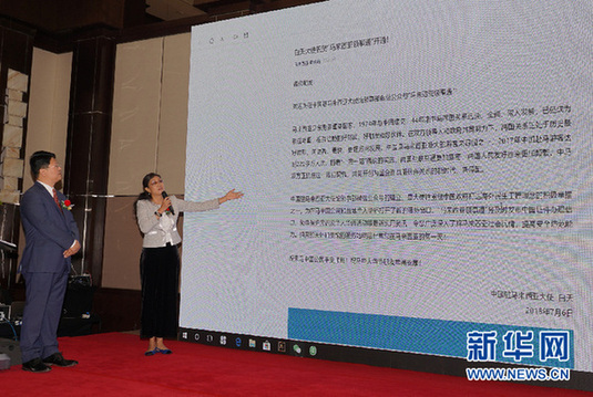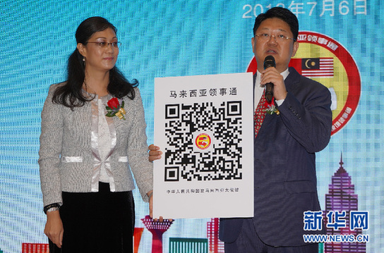 中国驻马来西亚大使白天(右)推介“马来西亚领事通”微信公众号。 新华网记者 林昊摄