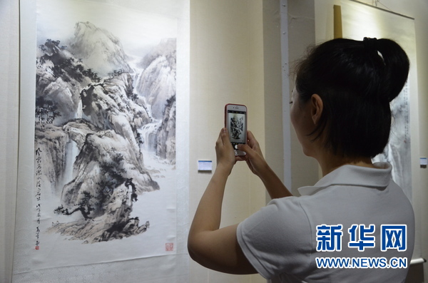 书画爱好者用手机拍摄参展作品。新华网发 王大玮摄