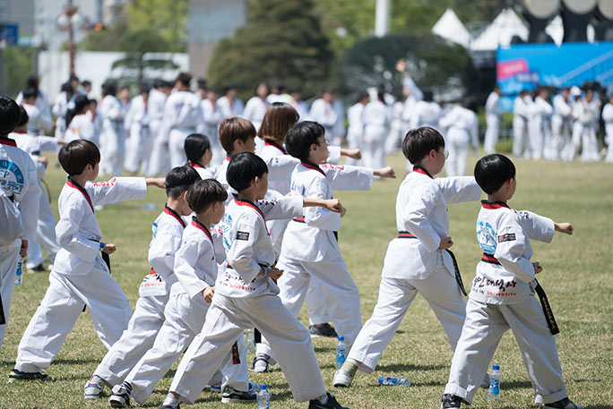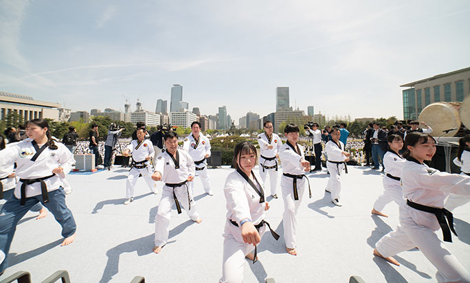 参加本次活动的既有年轻人,也有老年人。整个表演经过精心编排,持续了10分钟时间,所有参与者在表演中都穿着传统的跆拳道服。