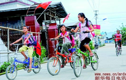 瑞丽市姐相乡银井小学的几名学生骑着自行车在去学校的路上(2011年5月26日摄)。新华社记者蔺以光摄
