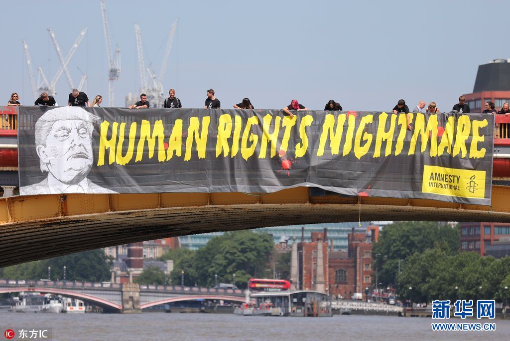 7月12日,英国伦敦,国际特赦组织成员在伦敦泰晤士河上沃克斯豪尔桥悬挂横幅,抗议美国总统特朗普到访英国。(图片来源:东方IC)