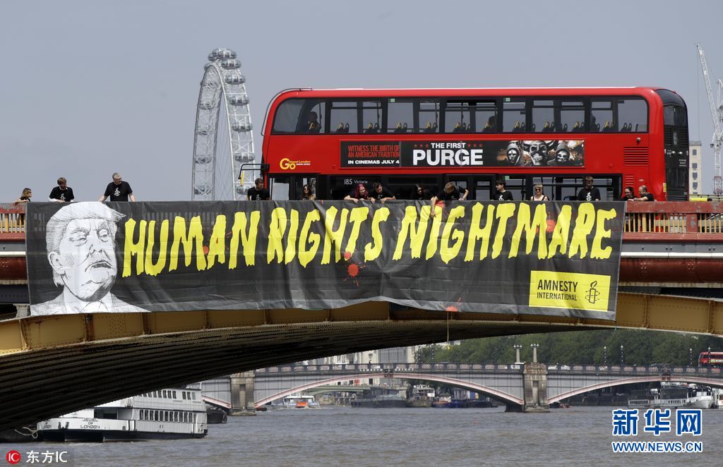 7月12日,英国伦敦,国际特赦组织成员在伦敦泰晤士河上沃克斯豪尔桥悬挂横幅,抗议美国总统特朗普到访英国。(图片来源:东方IC)