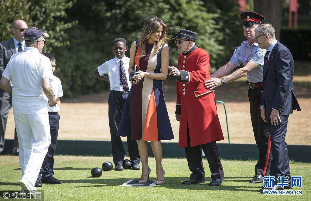 梅拉尼娅探望英退伍老兵 玩草地保龄球身手不凡(图)