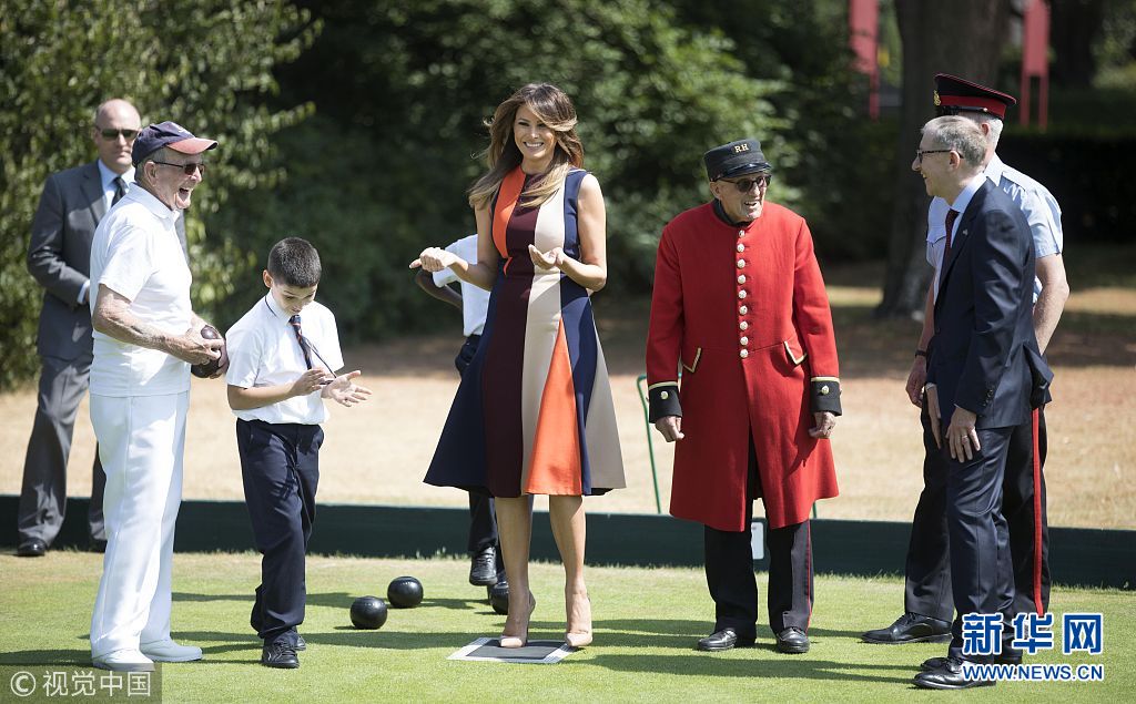 当地时间2018年7月13日,英国伦敦,美国“第一夫人”梅拉尼娅前往切尔西皇家医院探望退伍老兵,与老兵同玩草地保龄球。(图片来源:视觉中国)