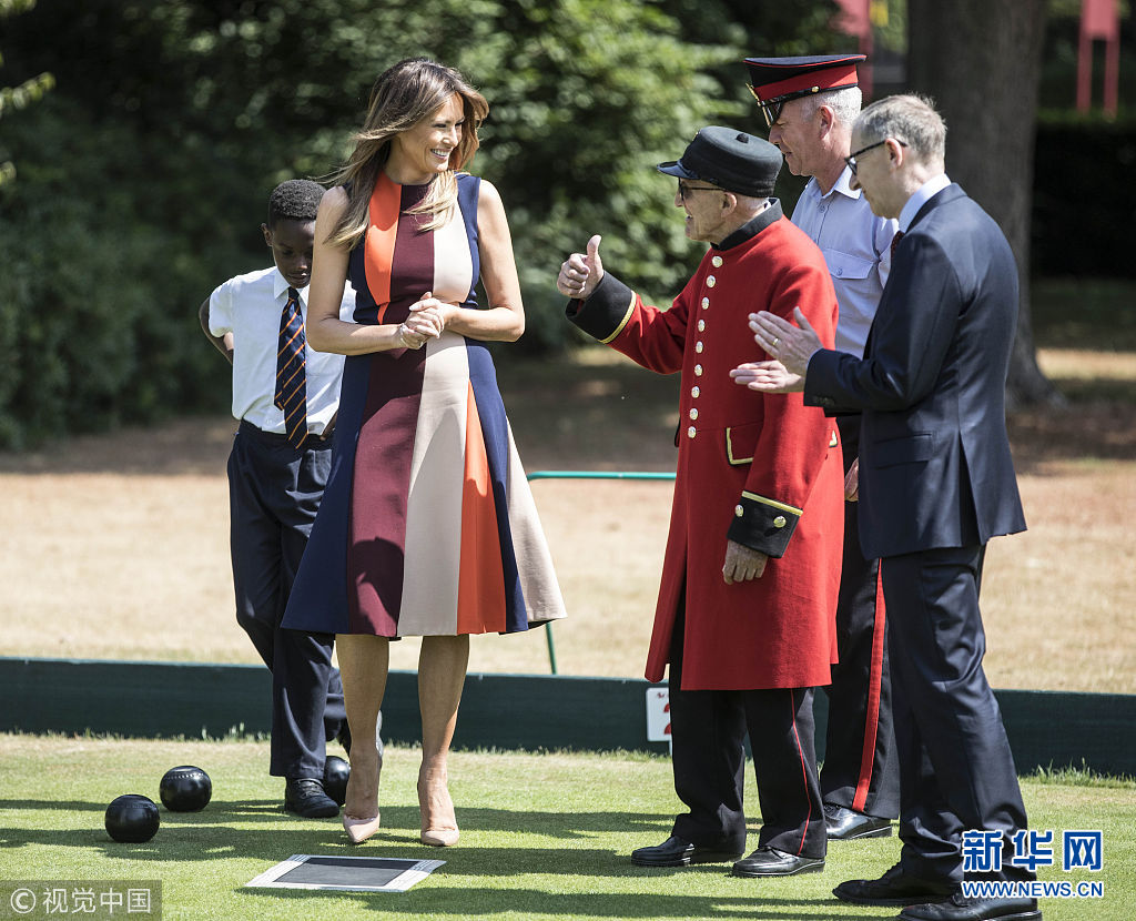 当地时间2018年7月13日,英国伦敦,美国“第一夫人”梅拉尼娅前往切尔西皇家医院探望退伍老兵,与老兵同玩草地保龄球。(图片来源:视觉中国)