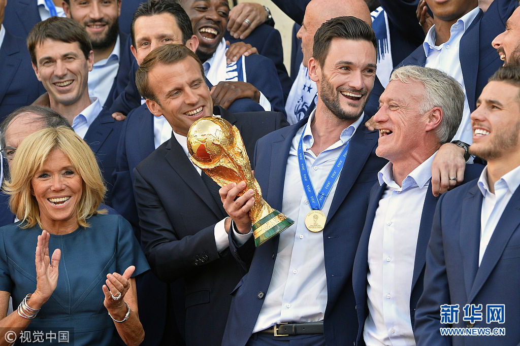 马克龙爱丽舍宫接见夺冠法国队 与队员共捧杯欢庆