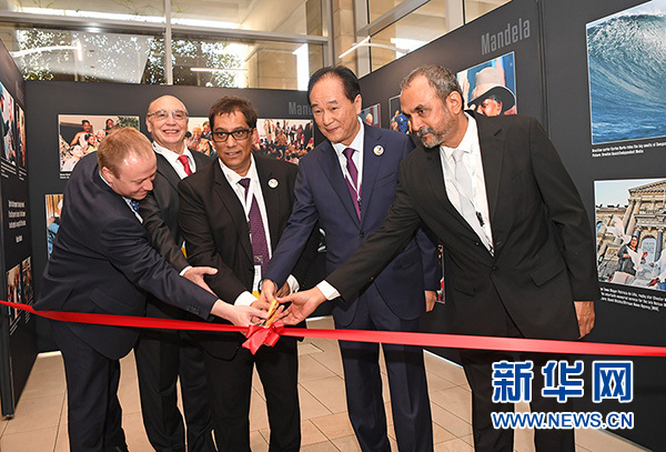 7月18日,在南非开普敦,金砖国家媒体主席团成员为联合摄影展开幕剪彩。新华社记者陈诚摄