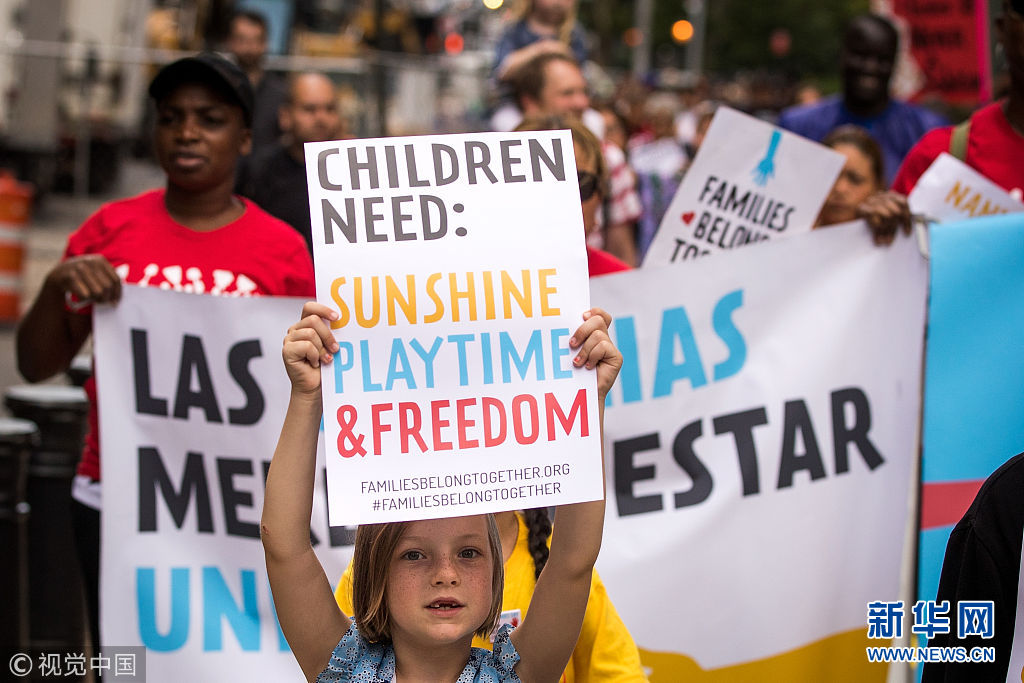 当地时间2018年7月18日,美国纽约,包括托儿所从业人员、父母及其子女在内的社会各界人士在美国移民和海关执法局(ICE)附近组织示威游行,抗议特朗普政府近期在美国南部边境实施针对非法移民家庭的强制拘留和家庭成员离散政策。 当天,共和党领导的众议院通过了支持ICE的决议,并谴责一些民主党人和进步积极分子要求废除ICE的呼声。(图片来源:视觉中国)