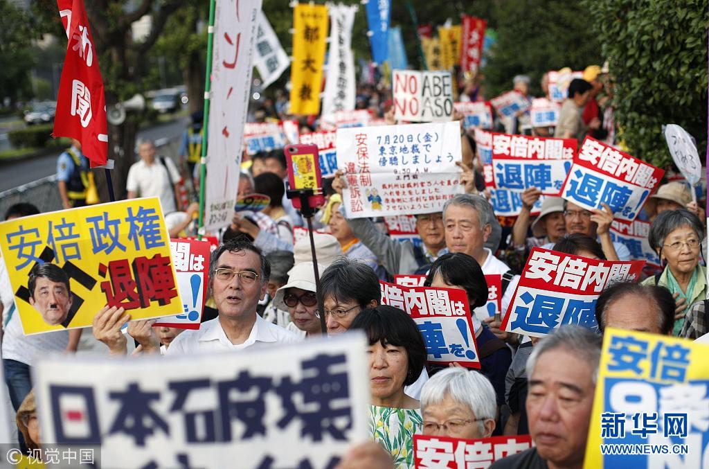当地时间2018年7月19日,日本东京,日本民众聚集在国会外,要求安倍内阁下台。(图片来源:视觉中国)