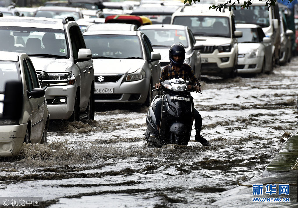 当地时间2018年7月20日,印度新德里,由于连日暴雨,道路出现积水影响民众出行。(图片来源:视觉中国)