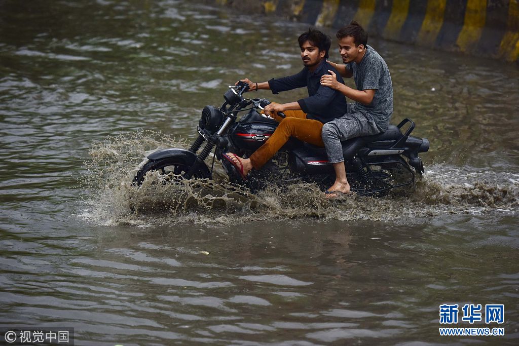 当地时间2018年7月21日,印度诺伊达,由于连日暴雨,道路出现积水影响民众出行。(图片来源:视觉中国)