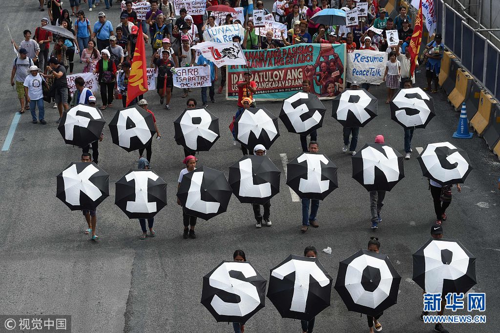 当地时间2018年7月23日,菲律宾马尼拉,反政府抗议者游行前往国会。菲律宾总统杜特尔特当日在国会发表国情咨文。(图片来源:视觉中国)