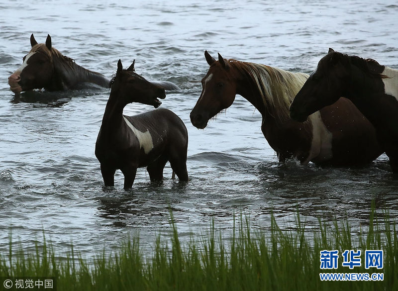 2018年7月25日,美国钦科蒂格,当地举行一年一度的小马游泳节(Pony Swim)。(图片来源:视觉中国)