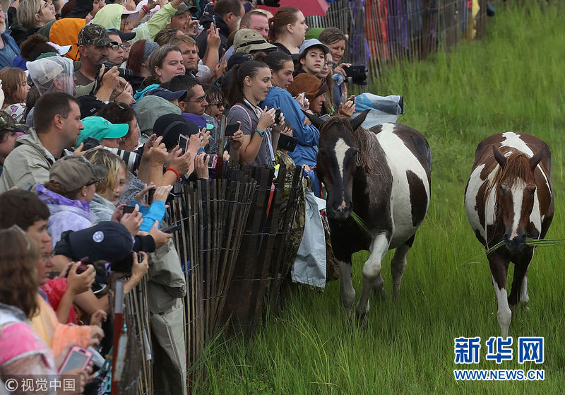 2018年7月25日,美国钦科蒂格,当地举行一年一度的小马游泳节(Pony Swim)。(图片来源:视觉中国)