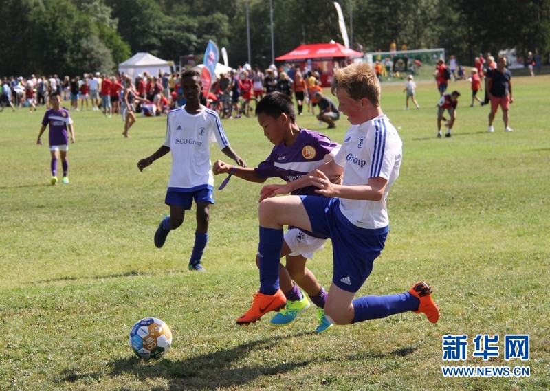 7月29日,中国广州新港小学男队在“挪威杯”国际青少年足球锦标赛中迎战挪威队。新华网记者 张淑惠 摄