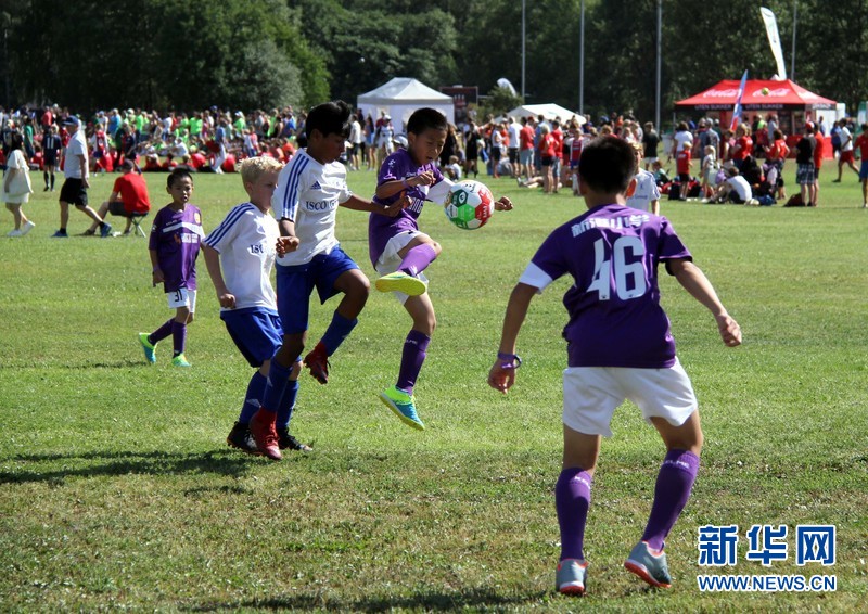 7月29日,中国广州新港小学男队在“挪威杯”国际青少年足球锦标赛中迎战挪威队。新华网记者 张淑惠 摄