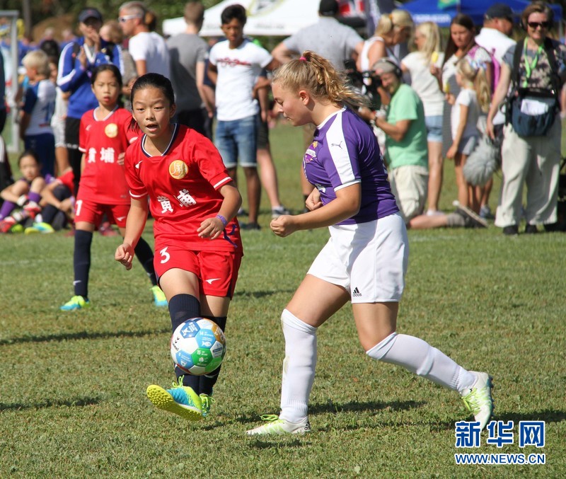 7月29日,中国广州新港小学女队在“挪威杯”国际青少年足球锦标赛中迎战挪威队。新华网记者 张淑惠 摄