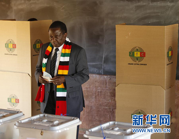 7月30日,在津巴布韦奎奎市,总统姆南加古瓦在一处投票站参加投票。 新华社发(肖恩·朱萨摄)