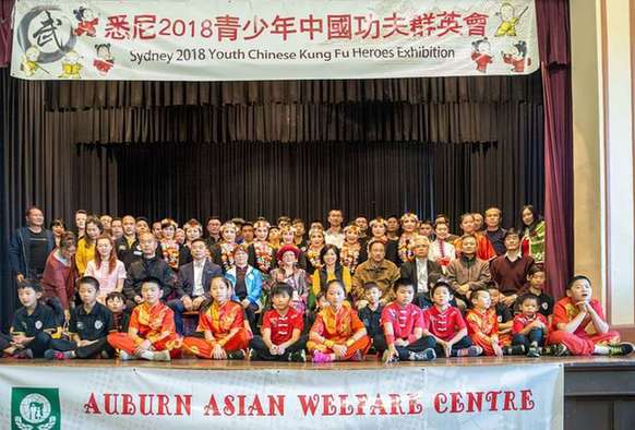 参加首届“悉尼青少年中国功夫群英会”的青少年武术运动员、精武体育会会员和嘉宾合影。新华网发(图片由澳大利亚新州精武体育会提供)