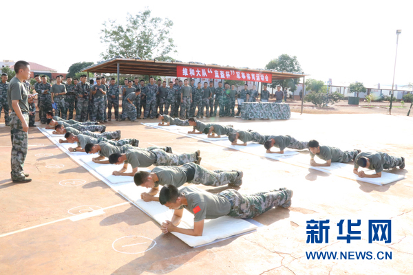 中国第八批赴南苏丹(瓦乌)工程兵大队官兵正在进行军事训练。新华网发(张晓昆 摄)