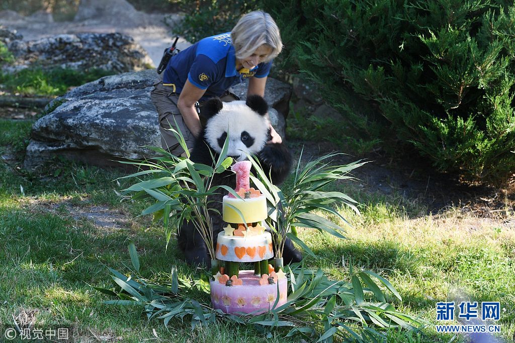 当地时间2018年8月4日,法国博瓦尔动物园,在法国出生的第一只熊猫宝宝“圆梦”迎来1岁生日,它的父母是“欢欢”和“圆仔”。 (图片来源:视觉中国)