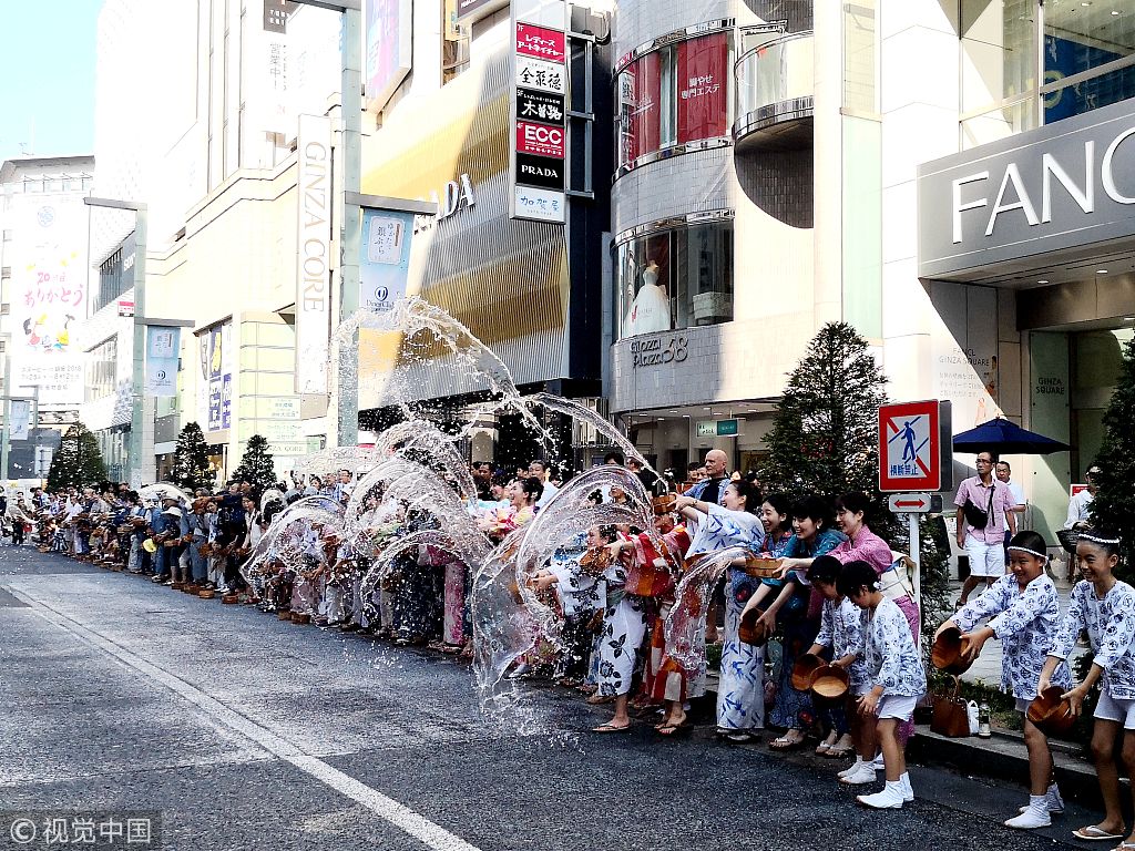 当地时间2018年08月05日,日本东京,在东京银座举行的“穿和服逛银座2018”纳凉活动,吸引市民游客,特别是当天下午的两次“集体泼水”活动,成为银座一道夏日风景画。(图片来源:视觉中国)