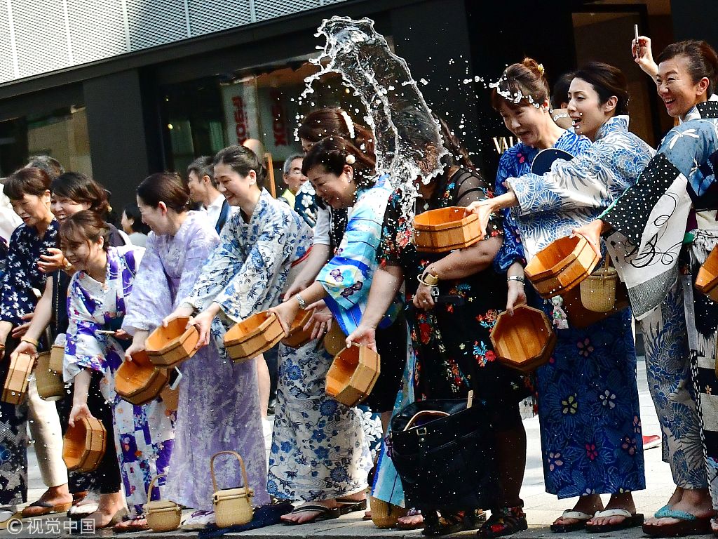 当地时间2018年08月05日,日本东京,在东京银座举行的“穿和服逛银座2018”纳凉活动,吸引市民游客,特别是当天下午的两次“集体泼水”活动,成为银座一道夏日风景画。(图片来源:视觉中国)