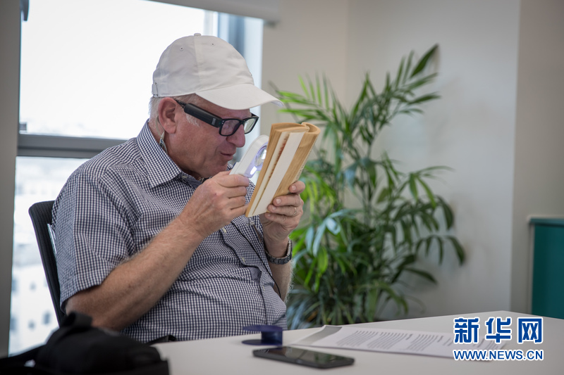 “OrCam我的眼睛”使用者莫什·费谢尔在看书。新华网记者 郭昱 摄