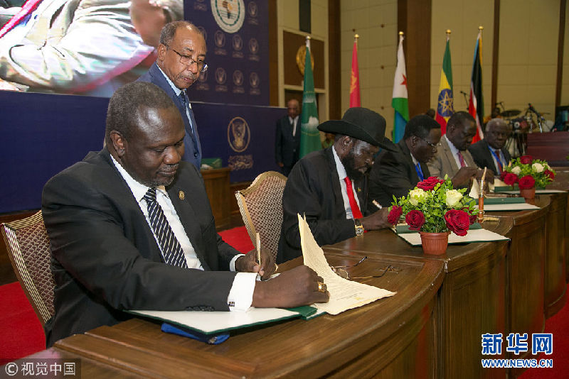 8月5日,南苏丹总统萨尔瓦·基尔与最大反对派领导人里克·马沙尔在苏丹首都喀土穆签署和平协议,同意分享权力、组建过渡性联合政府。(图片来源:视觉中国)