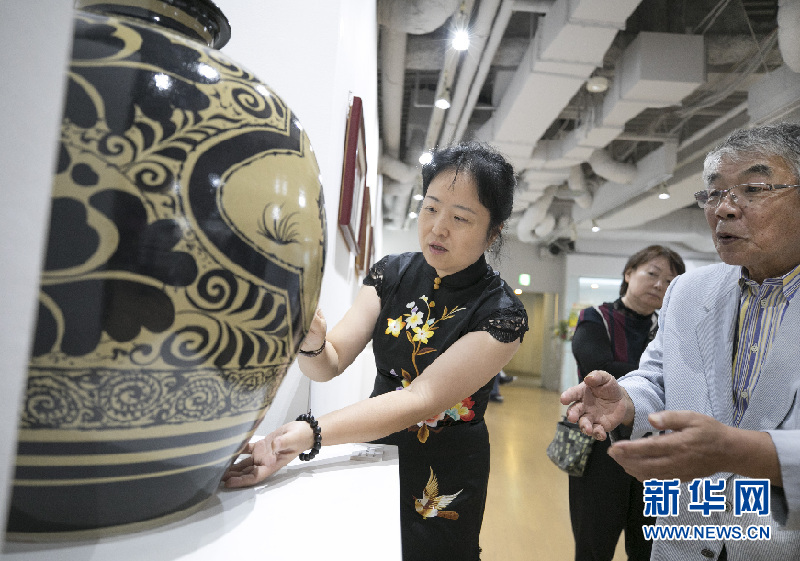 8月6日,日本横滨,景德镇陶瓷大学副教授刘晓玉(左)在展览现场向参观者介绍作品制作工艺。新华网记者 杜潇逸摄