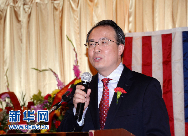 8月5日,中国驻芝加哥总领事洪磊在华联会就职典礼上致辞。新华网发 张大卫摄