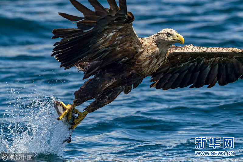 2018年8月7日讯(具体拍摄时间不详),英国苏格兰,野生动物摄影师Andy Howard拍摄一只白尾鹰在马尔岛海域捕获一条鱼的画面,这种大鸟有长达8英尺(2.4米)的翼展。(图片来源:视觉中国)