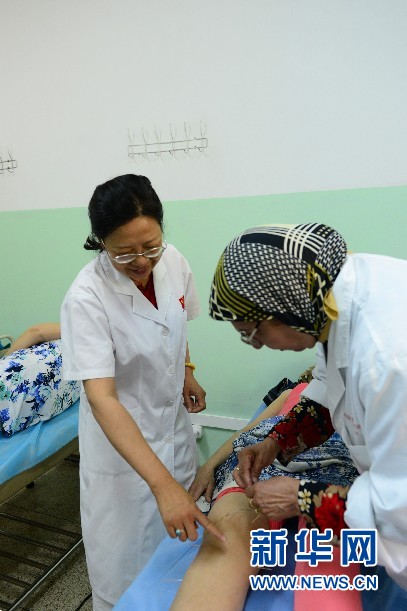 穆罕默迪亚队潘云华医生指导摩洛哥护士给患者做针灸治疗。新华网发