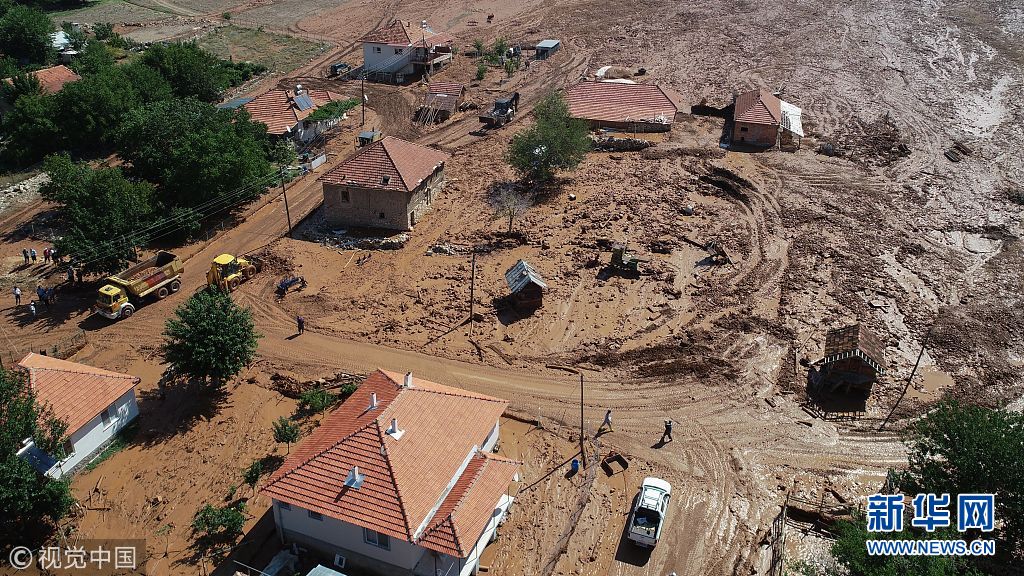 当地时间2018年8月8日,土耳其安塔利亚,由于当地遭遇暴雨袭击,道路被泥浆淹没,房屋和谷仓也被洪水破坏。(图片来源:视觉中国)
