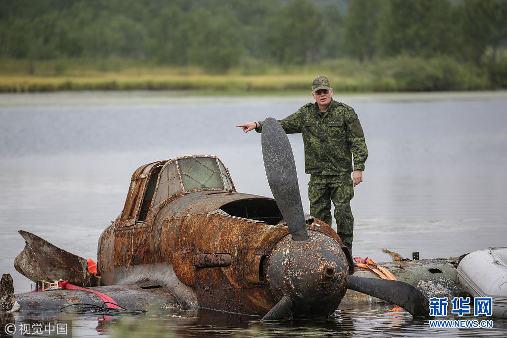 当地时间2018年8月9日,俄罗斯摩尔曼斯克州,一架卫国战争时期伊尔Il-2地面攻击机从Kulonga湖底被打捞上来。(图片来源:视觉中国)