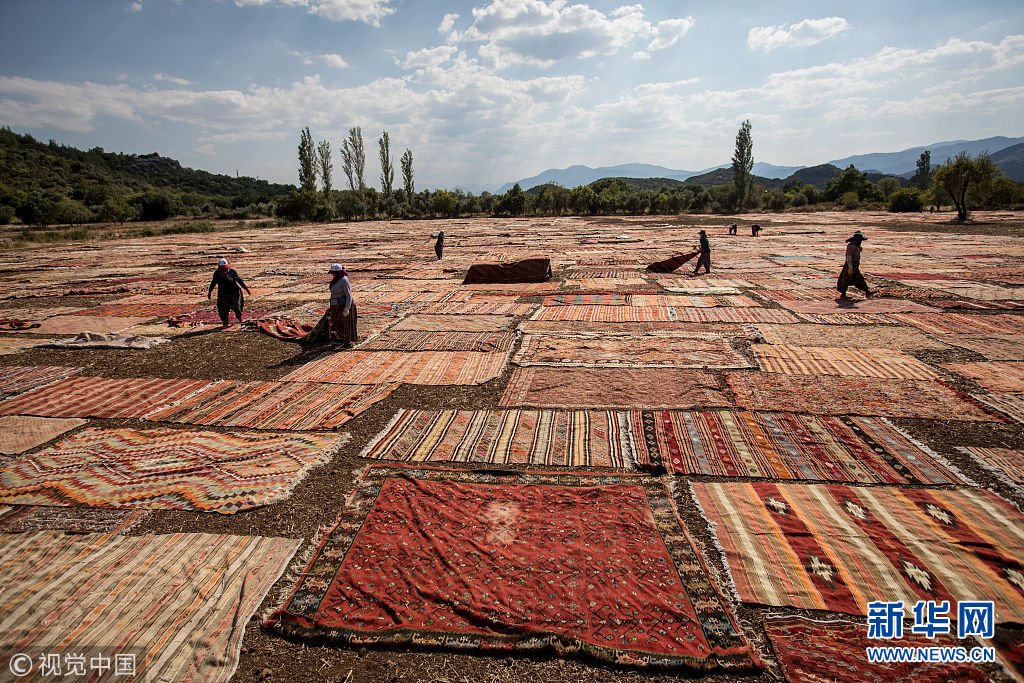 8月10日,土耳其安塔利亚省多塞米阿尔蒂,在炙热的阳光下,人们在田野里铺上地毯,使地毯的颜色变得柔和。(图片来源:视觉中国)