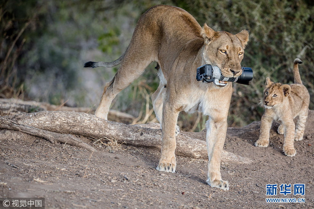 近日,非洲博茨瓦纳马沙图野生动物保护区内一头狮子叼起摄影师掉落在地上的相机,之后还将相机交给小狮子们玩耍,看起来十分好奇,而摄影师非常无奈。现年57岁的丛林探险家Barbara Jensen Vorster在一辆越野车上为马沙图野生动物保护区的狮群拍照时,相机不小心掉到了地上。砰的一声响惊动了母狮子,它向摄影师方向移动,迫使探险队撤退。 (图片来源:视觉中国)