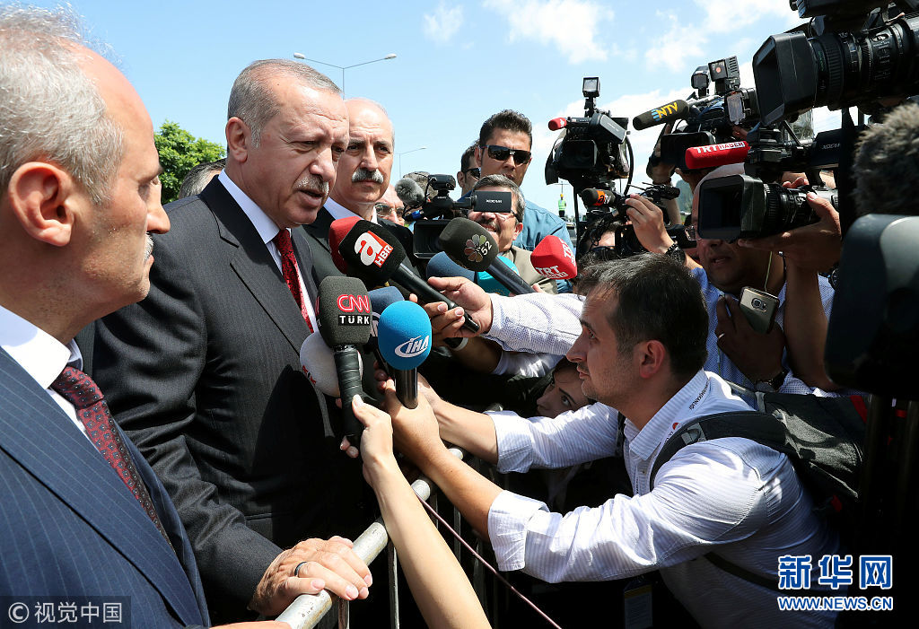 当地时间2018年8月11日,土耳其奥尔杜,土耳其总统埃尔多安接受媒体采访。美国政府10号宣布将土耳其钢铁和铝产品进口关税提高一倍。土耳其总统埃尔多安对此表示,对于某个国家发起的“经济战”,土耳其会坚决应对,无惧威胁。(图片来源:视觉中国)