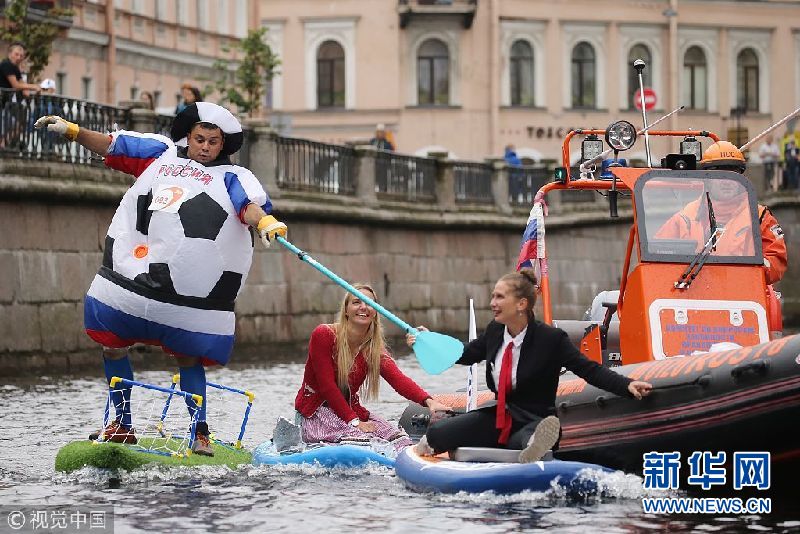当地时间2018年8月12日,俄罗斯圣彼得堡,当地举行桨板冲浪节,民众奇葩造型亮相热闹非凡。(图片来源:视觉中国)