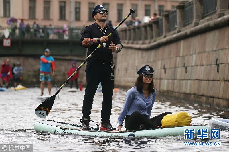 当地时间2018年8月12日,俄罗斯圣彼得堡,当地举行桨板冲浪节,民众奇葩造型亮相热闹非凡。 (图片来源:视觉中国)