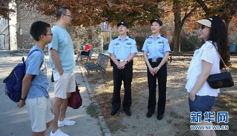 8月10日,参加首次中克旅游季警务联巡的中国警察梁书恺(左三)和魏茗(右二)在克罗地亚首都萨格勒布与中国游客交谈。当天,在中国警察推动下,克罗地亚警方正式启用标注中文的报警表格。新华网发 扎尔科·巴西奇摄