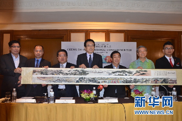 马来西亚总理对华事务特使陈国伟(右3)、中国驻马大使馆文化处主任张杰鑫(左4)、中国郑和研究会副会长孙治国(左3)等嘉宾在新闻发布会上展示王新循创作的《郑和下西洋》长卷复制品。 新华网发 王大玮摄