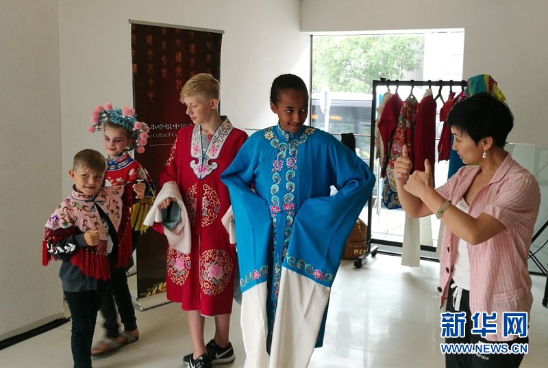 中国黑龙江省京剧团演员为丹麦小粉丝们的表现点赞。新华网发(张力摄)