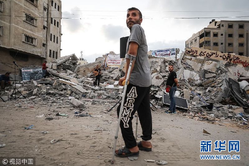 当地时间2018年8月15日,加沙加沙城,埃及“Devavin”乐队在被以军空袭过的Said al-Mishal文化中心废墟上表演。(图片来源:视觉中国)